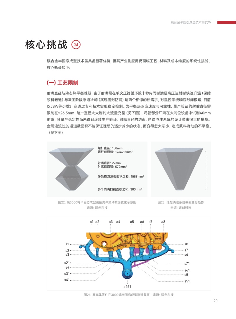 《鎂合金半固態(tài)成型技術(shù)白皮書》部分內(nèi)容 主題演講持續(xù)2天,現(xiàn)場座無虛席,吸引了眾多關(guān)注輕量化解決方案的參展者參加。 適創(chuàng)科技薛鵬基總監(jiān)結(jié)合白皮書內(nèi)容,深入剖析了該技術(shù)在實現(xiàn)復(fù)雜、薄壁、高強輕量化部件制造上的獨特優(yōu)勢,特別是在新能源汽車、3C電子、人形機器人等對減重和性能要求嚴(yán)苛領(lǐng)域的巨大潛力。同時,薛鵬基總監(jiān)詳細(xì)闡述了當(dāng)前工藝面臨的核心約束與挑戰(zhàn),指出該技術(shù)產(chǎn)業(yè)化推廣的主要難點。