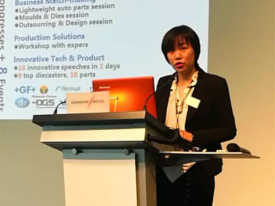 張小巖秘書長做報告 紐倫堡會展中國項目總監馮琦女士以中國壓鑄展CHINA DIECASTING作為切入點,介紹了紐倫堡會展中國公司如何幫助外資企業開拓中國市場,成為他們最佳的市場伙伴,從參加展覽會、分享媒體資源,一直到訂制化市場推廣的方案,既能推廣節省成本,又能享受許多增值服務,為外企進入中國市場做了許多的鋪墊工作。
