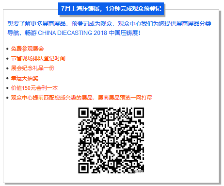 由鑄造行業生產力促進中心、中國機械工程學會鑄造分會(FICMES)舉辦的CHINA DIECASTING 中國壓鑄展將于2018年7月18-20日在上海新國際博覽中心舉辦。展會面積達到36,000平方米,參展企業400余家,專業觀眾達18,000余人,將為壓鑄行業帶來一場專業化的視聽盛宴!