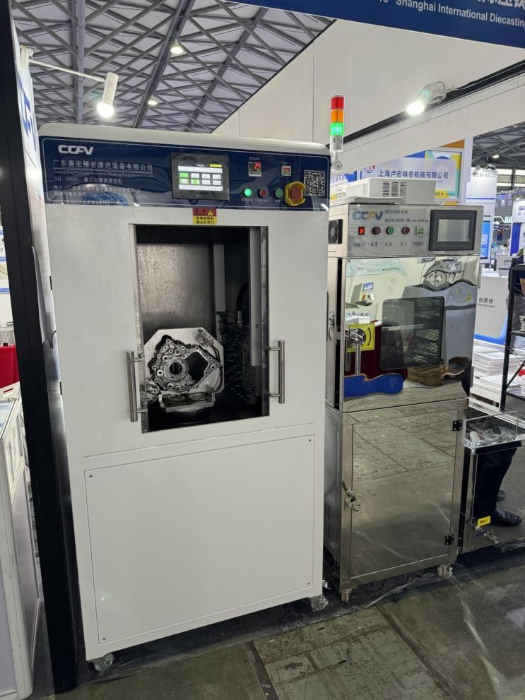 廣東賽宏參展團隊 廣東賽宏總經(jīng)理余松先生指出,鋁合金壓鑄件的清洗面臨諸多挑戰(zhàn),包括材質(zhì)的特殊性、清洗效果的難以保證、復(fù)雜的清洗工藝、嚴格的環(huán)保和安全要求,以及自動化清洗的實現(xiàn)等。為了克服這些難點,廣東賽宏不斷研發(fā)和改進清洗技術(shù)、工藝和設(shè)備,提升操作人員的技能和經(jīng)驗水平,并加強環(huán)保和安全措施的實施。 作為壓鑄行業(yè)的專業(yè)級清洗設(shè)備供應(yīng)商,廣東賽宏一直致力于壓鑄件的表面清洗及設(shè)備的研發(fā)制造。為提升壓鑄產(chǎn)品的清潔度,公司持續(xù)投入研發(fā),并在公司內(nèi)部建立了完善的多種模式的試驗設(shè)備和清潔度檢測設(shè)備,以滿足客戶售前的測試要求。通過多種工藝的組合測試,廣東賽宏為客戶提供多樣化、高清潔度的清洗工藝解決方案。 此次展出的單體式機邊隨形清洗機,具有占地面積小、定位精度高、清洗潔凈度高等特點。該設(shè)備可直接放置在CNC加工中心后,進行直接清洗。經(jīng)過后端的單體式真空干燥后,產(chǎn)品可直接包裝出貨,減少了產(chǎn)品周轉(zhuǎn)帶來的其他風(fēng)險。同時,該設(shè)備還具備定點定位清洗功能、定孔吹干功能、旋轉(zhuǎn)脫水功能以及超凈過濾循環(huán)功能。在當前的市場環(huán)境下,因其投入小且能解決一些大的清洗問題,所以備受客戶歡迎。