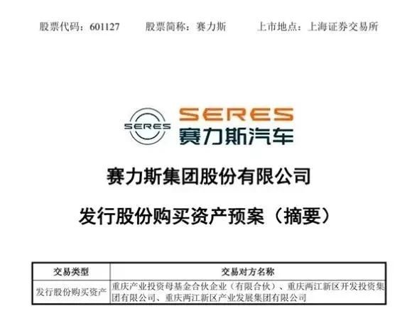 全賽力斯擬引入重慶國資,全資收購AITO問界工廠服務商 賽力斯近日發(fā)布公告,其擬發(fā)行股份購買重慶產(chǎn)業(yè)投資母基金合伙企業(yè)(有限合伙)、重慶兩江新區(qū)開發(fā)投資集團有限公司、重慶兩江新區(qū)產(chǎn)業(yè)發(fā)展集團有限公司持有的重慶兩江新區(qū)龍盛新能源科技有限責任公司100%的股權(quán)。