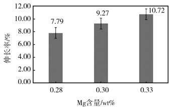 圖6 不同Mg含量材料的硬度值 從圖7中可以看出,隨著Mg含量(0.28%~0.33%)的增加,某款前副車架本體材料的伸長率逐漸增大,這表明隨著Mg含量的增加,材料的韌性逐漸增強(qiáng)。其原因在于Mg含量的增加能夠細(xì)化的共晶硅,使硅相能更均勻地分布于鋁基體中,應(yīng)力分布更加均勻,從而增強(qiáng)了合金材料的韌性。