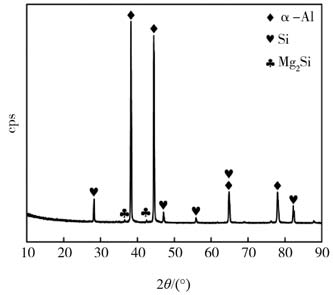 圖3 不同Mg含量副車架試樣的金相組織 Mg含量的增加也會(huì)改變共晶硅的形態(tài),使其由短棒狀或大顆粒轉(zhuǎn)變或細(xì)小顆粒狀,這種轉(zhuǎn)變對(duì)基體α-Al的割裂作用降低,降低了產(chǎn)生應(yīng)力集中的可能性,提高了合金的斷裂韌性和抗拉性能。圖4所示為Mg含量為0.33%的鑄件組織XRD圖譜。結(jié)合圖3(c),可以觀察到,當(dāng)Mg含量為0.33%時(shí),金相組織中有少量呈現(xiàn)深色顆粒狀的Mg2Si相,這說明溶解在鋁基體中的Mg會(huì)與Si反應(yīng),形成Mg2Si相,隨著Mg含量的增加Mg2Si相的析出量增多,能有效提高合金的抗拉強(qiáng)度和硬度。