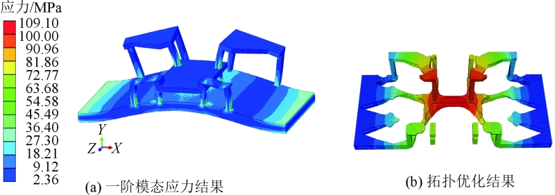 圖3 雙機器人切削加工單元 XY平面方向定位:前艙鑄件外形尺寸巨大,相比傳統的壓鑄件,鑄件的變形量也較大。經過壓鑄模擬分析,發現在壓鑄工藝的中部區域以及前端部位,鑄件的變形程度相對較小,即便存在變形情況,也主要表現為從中間向輪轂兩端的方向輕微拉長。圖4為前艙鑄件的機加工定位示意圖。 前艙鑄件的尺寸較大,為1 650 mm×950 mm×630 mm,這給相關的夾具設計帶來了全新的挑戰。按照傳統的夾具設計模式來進行設計,夾具的質量將會增大,甚至可能達到2.5 t。然而, CNC設備的第6軸轉臺的承重能力最大僅為1.2 t。這說明按照傳統方式設計的夾具質量將遠超過轉臺的承重能力,從而無法進行正常的加工操作。為了克服這一難題,需要對前艙鑄件的夾具整體框架結構進行輕量化設計,通過夾具鏤空減重技術,將夾具質量控制在1 t左右。根據夾緊位置和輔助支撐位置,確定出夾具的大致構造,見圖5,由1個基座和5個平臺構成。對圖5的結構進行一階模態分析和施加載荷進行拓撲優化,結果見圖6。