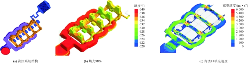 圖2 變質處理前后ADC12合金的金相組織 使用AnyCasting軟件進行CAE流場模擬數值分析。首先根據鑄件本身的結構特點,結合類似產品零件的經驗,設計壓鑄件的澆排系統,再通過不同的工藝參數進行多次模擬分析,在此過程中對橫澆道的形狀和內澆口的厚度進行優化,最終確定的工藝參數見表2。優化的模擬填充順序、填充速度結果見圖3。針對鑄件的開發難點即厚壁處可能出現的鑄造缺陷進行詳細的凝固收縮過程分析,凝固順序及收縮缺陷分析結果見圖4。 表2 壓鑄工藝參數
