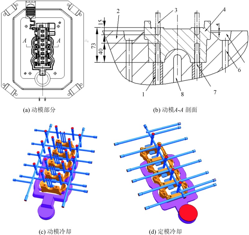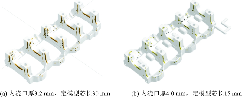 圖4 ADC12鑄件凝固過程分析 由圖3可見,金屬液在充填過程中從內澆口流入型腔,在前4個支撐座充滿之后,熔體才在壓力下流向第5個支撐座。當充填至98%時,只有最后一個支撐座的溢流槽和排氣道未充滿,配合末端抽真空系統,充填過程較穩定;內澆道填充速度在48 m/s時不會出現對型腔的沖蝕,但由于內澆口正對型芯,會沖蝕型芯并且影響金屬液的流向,易出現卷氣。在模具設計時考慮適當縮短型芯高度尺寸,留出金屬液流動的通道。圖4為ADC12合金凝固過程分析。通過圖4發現鑄件在5個支撐座厚壁區域,會出現不同程度的縮孔和縮松,這主要是由于產品的結構所致。鑄件局部體積過大,金屬液凝固過程中體積收縮,得不到外來金屬液的補充,則會產生縮孔和縮松。分析表明,支撐座中間可能出現的縮孔縮松基本上距離軸瓦加工面10 mm以外,對鑄件的性能影響很小。為減少中間厚壁部位產生縮孔縮松,模具設計時要考慮內澆口的厚度及預留足夠的填充通道,以保證在金屬液充填完畢到完全凝固之前,進行加壓補縮。圖5為加大內澆口厚度縮短定模型芯長度后,鑄件縮松的分布位置及狀態對比圖。當內澆口厚4.0 mm,定模型芯長15 mm時,鑄件內部縮松相比內澆口厚度為3.2 mm,定模型長為30 mm時明顯減少。 根據數值模擬方案,發動機主軸承座壓鑄模的澆注系統采用縱向雙向填充,每個軸承座軸頸兩側布置大容量的集渣包,在填充末端采用阻尼式抽真空,模具結構示意圖見圖6。型腔采用整體式鑲塊結構,成形部分通過高速銑數控加工,局部異形及小圓角處采用電火花加工。根據產品結構及形狀,鑄件成形部分采用推管推出,澆道及集渣包采用推桿推出。依據模擬分析的結果,模具設計時,在滿足內澆口截面積的基礎上,適當增大內澆口厚度,同時縮短定模型芯長度,給金屬液留出補縮的通道,見圖5b。