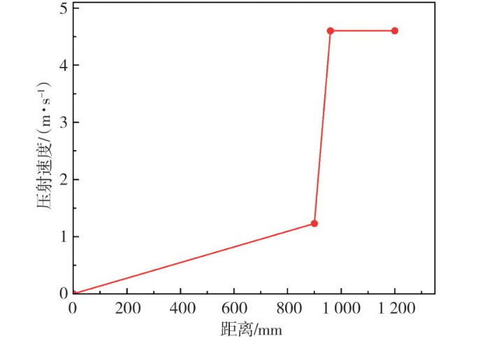 表2 主要壓鑄工藝參數 合理的溫控策略可提高鑄件質量和優化生產效率,為此研究不同溫控策略對汽車車門成形過程的影響具有重大意義。設置了三種不同的溫控方案,分別是空冷、油加熱+水加熱+水冷、全水冷,模具上集成的溫控系統如圖2所示。其中,壓射過程中低速階段采用勻加速壓射工藝,其最高臨界速度為1.23 m/s,高速速度為4.6 m/s,具體壓射工藝曲線如圖3所示。另外,起高速位置為900 mm,增壓壓力為60 MPa。