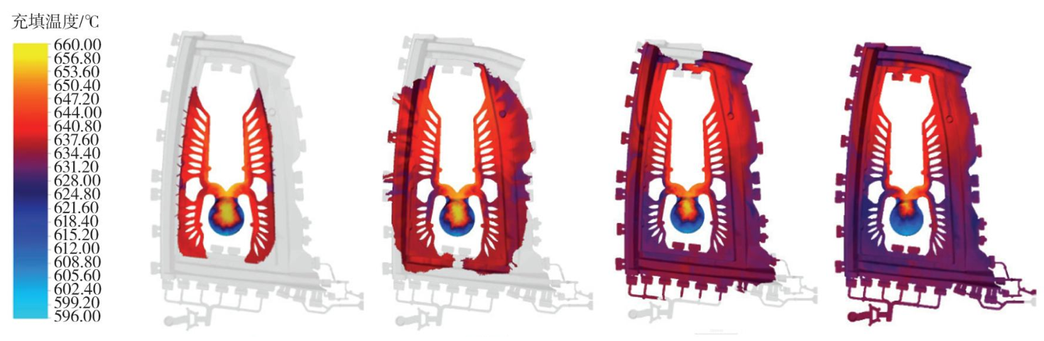 圖3 壓射工藝曲線示意圖 2.2 勻加速壓射工藝對料管內熔體流動狀態的影響 采用SuperCAST智鑄超云分別模擬了低速階段采用勻加速壓射工藝,其最高臨界速度為1.23 m/s,高速速度為4.6 m/s,起高速位置為900 mm,增壓壓力為60 MPa條件下料管內金屬液流動狀態,結果如圖4所示。鑄件充型過程中,可以看到料管中溫度較高的金屬熔體呈逐漸減少趨勢,最后溫度降低的熔體被“舍棄”在料管中,避免了低溫熔體影響鑄件質量。鑄件充型過程中還可以發現,在澆口的充填溫度均勻,料管到內澆口的溫度梯度較小。充型后金屬熔體快速填充到鑄件中,符合由“近及遠”的充填規律,整體分布合理。