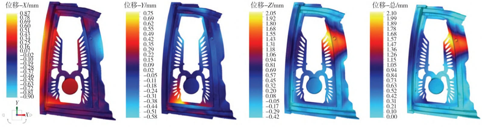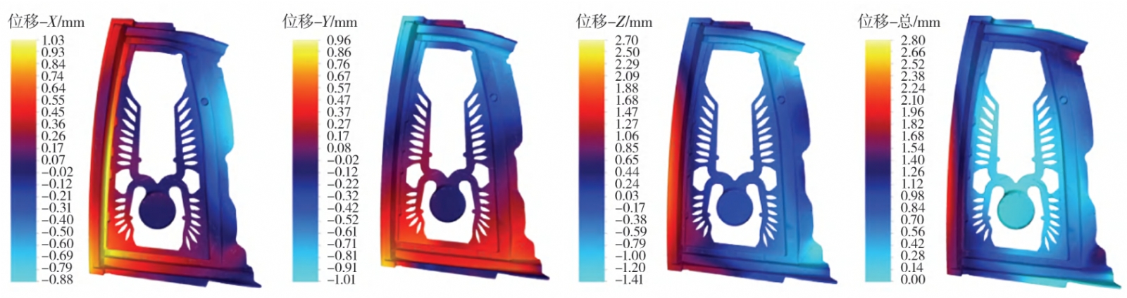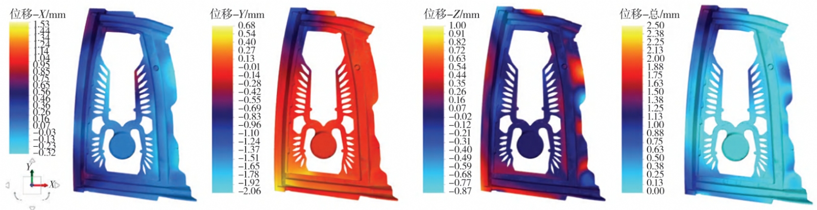 圖4 汽車車門鑄件充型過程溫度場云圖 2.3 不同溫控策略對熱位移的影響 分別模擬了三種不同溫控策略(分別是空冷、油加熱+水加熱+水冷和全水冷)對鑄件熱位移的影響,其中紅色表示正位移,藍色表示負位移,結果如圖5至圖7所示。本研究中位移方向描述以鑄件正面朝向觀測者為基準,X方向為鑄件左右水平方向(向右為正),Y方向為鑄件上下豎直方向(向上為正),Z方向為鑄件法向(朝向觀測者為正);上移、下沉等表述對應Y方向的位移變化,向外/內陷對應Z方向的位移變化,左右偏移對應X方向的位移變化。