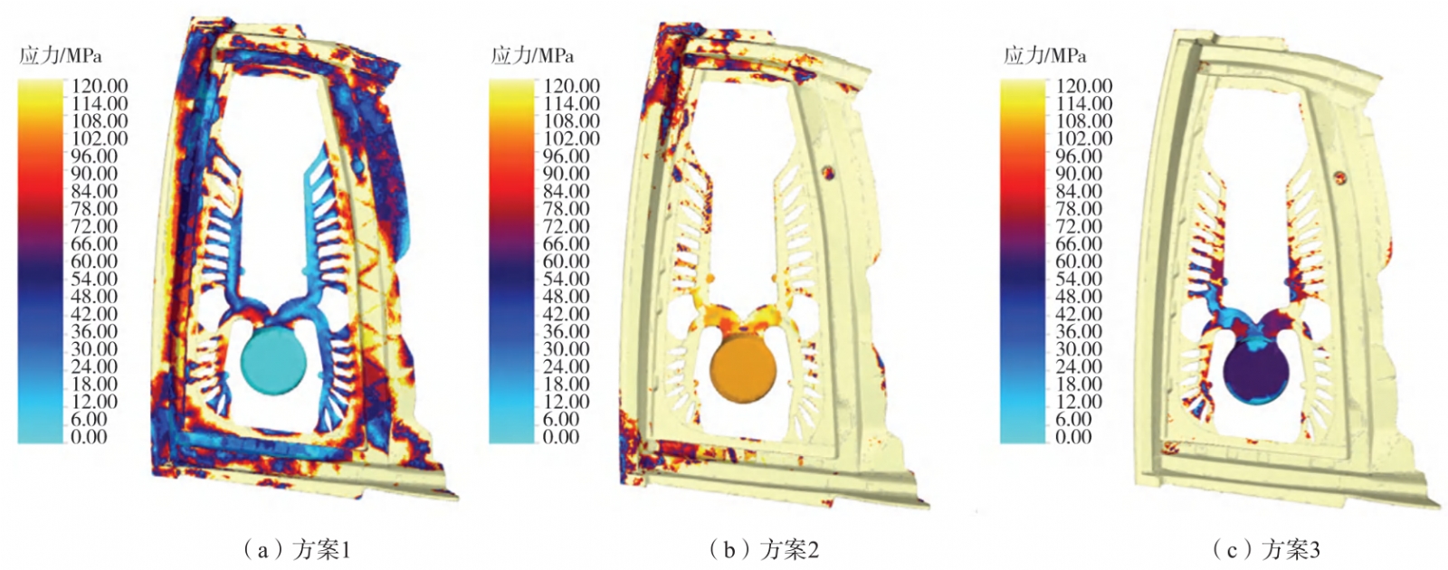 圖7 方案3位移場 對于方案1,從圖5中的位移標尺可以看出,X方向的位移值從-0.88 mm到1.03 mm,鑄件在左上和左側區域有較大的正位移,右下和右側區域則有負位移,鑄件在X方向上的位移場分布存在明顯的不均勻性,尤其是在外部邊緣區域。Y方向的位移值從-1.01 mm到0.96 mm,Y方向位移呈現出上下相反的變化趨勢,即中部和上部的區域有明顯的下沉趨勢,而底部區域則有明顯的上升趨勢。Z方向的位移值從-1.41 mm到+2.70 mm,左邊邊緣區域的位移明顯更大,顯示出一種由結構邊緣向內部遞減的趨勢。總方向的位移值從0到2.8 mm,主要的位移集中在上部和左側邊緣,而中部區域保持了相對的穩定。 對于方案2,從圖6中的位移標尺可以看出,X方向的位移值從-0.42 mm 到1.53 mm,X方向的位移場總體上表現出左右方向的位移差異,左上部和某些邊緣區域有明顯的向右位移,而右側和底部的部分邊緣表現為向左位移。Y方向的位移值從-2.06 mm到0.68 mm,Y方向的位移場整體上顯示出右側邊緣的上移趨勢和左下部區域的下沉趨勢。Z方向的位移值從-0.87 mm到1.00 mm,Z方向的位移場整體上表現出上升和下沉的趨勢:上部和右側邊緣部分上升趨勢,而左下部的區域有較大的下沉趨勢。總方向的位移值從0到2.50 mm,總位移場表現出較為顯著的彎曲和扭曲趨勢,尤其是在邊緣和左上、左下部位。 對于方案3,從圖7中的位移標尺可以看出,X方向的位移值從-0.90 mm到0.87 mm,X方向的位移場顯示出顯著的左右位移趨勢,左側的上部和邊緣區域有向右的正向位移,而右下和部分右側區域有向左的負向位移。Y方向的位移值從-0.58 mm到0.75 mm,Y方向的位移場顯示出上下方向的位移差異,底部中央有顯著的向上位移,而上部和右側部分有明顯的向下位移。Z方向的位移值從-0.42 mm到2.05 mm,Z方向的位移場顯示出顯著的左右位移差異:右側邊緣有較大的向外凸出變形,而左側下部則表現出輕微的內陷趨勢。總位移值從0到2.10 mm,總位移場的分布顯示出紅色區域主要集中在圖的右側邊緣部分,而左下和中部的淺藍色區域顯示位移較小。 綜上所述,方案1冷卻效率較低,邊緣區域的位移和應力集中最為顯著,熱位移不均勻性明顯,容易產生鑄造缺陷;方案2整體冷卻均勻性和位移分布較好,減少了邊緣區域的應力集中,但仍存在邊緣和中部的位移不均問題;方案3鑄件熱位移最小,但中部區域的位移出現位移集中現象仍需進一步調整該區域模具的溫控策略。 2.4 不同溫控策略對應力的影響 分別模擬了三種不同溫控策略對鑄件應力的影響,應力值依次增大,由淺藍色、藍色、橙色和紅色逐漸增加到黃色。黃色表示最大應力,而紅色表示次大應力,淺藍色表示最小應力,結果如圖8所示。對于方案1,黃色區域集中在左右兩側、上部中間和下側邊緣,該區域的應力均值為116 MPa,紅色區域主要出現在鑄件的轉角、邊緣和局部連接區域,該區域的應力均值為75 MPa。整體來看應力分布不均勻,高應力集中在邊緣和連接部位,這些位置可能存在應力集中導致失效風險。對于方案2,黃色區域占據了鑄件的大部分且應力均值為117 MPa,鑄件整體應力較高。紅色區域則集中在左上角和左下角,該區域的應力均值為76 MPa,存在局部應力集中風險,這可能會引起局部的變形和開裂。對于方案3,黃色區域幾乎覆蓋整個鑄件且該區域的應力均值為115 MPa,表明鑄件整體承受了較大的應力,紅色區域僅在凸臺和左下角局部出現且該區域的應力均值為74 MPa。雖然整體來看應力分布均勻,但整體應力水平較高,可能引發大范圍的變形風險。