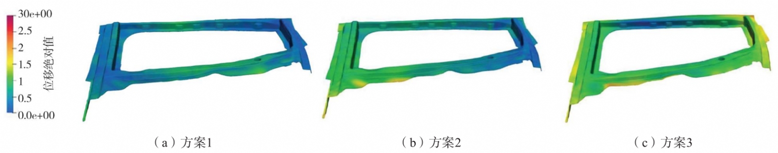 圖8 不同工藝方案汽車車門鑄件的應力場分布圖 綜上所述,方案1應力分布不均,邊緣和連接部位高應力集中,存在顯著的應力集中風險,可能導致鑄件變形或裂紋生成;方案2整體應力分布較為均衡,但局部的高應力區域集中在左上角和左下角,可能引起變形和開裂風險;方案3整體應力水平較高,黃色高應力區域幾乎覆蓋整個鑄件,雖然分布均勻,但整體高應力可能導致大范圍變形風險。綜合來看,方案2在應力均勻性和局部集中風險上表現較為平衡。 2.5 不同溫控策略對翹曲的影響 分別模擬了三種不同溫控策略對鑄件翹曲的影響,結果如圖9所示。方案1的翹曲較明顯,其部分區域顏色呈現綠色,主要集中在結構的中部和邊緣區域,可能是空冷的冷卻效果較差,溫度梯度較大,導致中部和邊緣之間的過渡區域易發生翹曲。此外,由于方案1應力分布極不均勻,邊緣以及連接部位存在顯著應力集中。應力集中區域(邊緣和中部過渡區)的應力差驅動材料發生非均勻收縮,最終表現為中部和邊緣區域的明顯翹曲,如圖9(a) 所示。方案2左右兩側的顏色不均勻,尤其是右側的黃色區域,顯示出冷卻過程中存在的溫差,導致翹曲值較大。盡管油和水的加熱、冷卻組合已經大幅減少了溫差,但冷卻速度的不同仍然導致該區域產生輕微的翹曲。方案2整體應力水平較高,但主要在左上角以及左下角部位存在局部應力集中,分布范圍小。局部應力集中區的應力梯度引發單側非均勻收縮,導致右側出現黃色區域(翹曲值較大),而其余區域因應力分布相對均衡,翹曲程度較輕微。方案3的顏色分布最為均勻,幾乎整個結構呈現一致的綠色,表明溫度分布均勻,沒有特定區域的溫度差異積累,因而各個部位的翹曲幾乎消失,結構保持了較高的尺寸穩定性。方案3整體應力水平高,但應力分布極均勻,無局部應力集中。均勻的應力場使鑄件各部位收縮變形一致,無明顯應力差驅動的非均勻變形,因此翹曲幾乎消失。