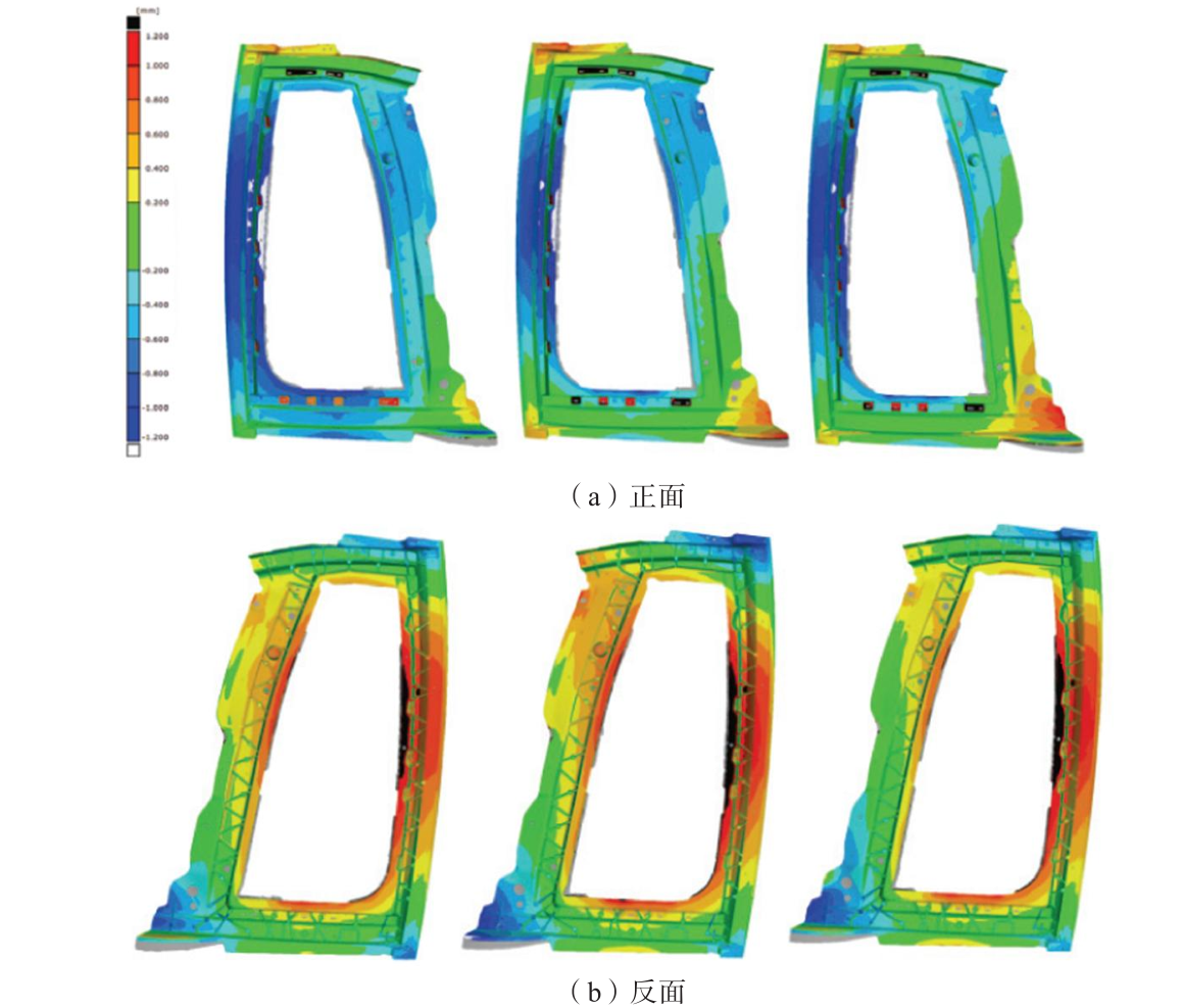 圖9 不同工藝方案汽車車門鑄件的翹曲分布圖 03 試驗驗證 采用力勁6800T壓鑄機進行汽車車門壓鑄試驗驗證,壓鑄過程中實施溫控方案2,即油加熱+水加熱+水冷。經過機械加工去除澆道、集渣包等工藝系統后,車門鑄件凈重為5.56 kg,其三件鑄件三維掃描正反面結果如圖10所示。其中紅色區域表示正向形變最大,而藍色區域表示負方向形變最大。三組數據的分析顯示,形變主要集中在鑄件的左右側和外部邊緣,以鑄件正面朝向觀測者的方位為基準。第一組和第二組的數據集中在左右側和外部邊緣的形變較大,而第三組則在右側形變范圍更大。