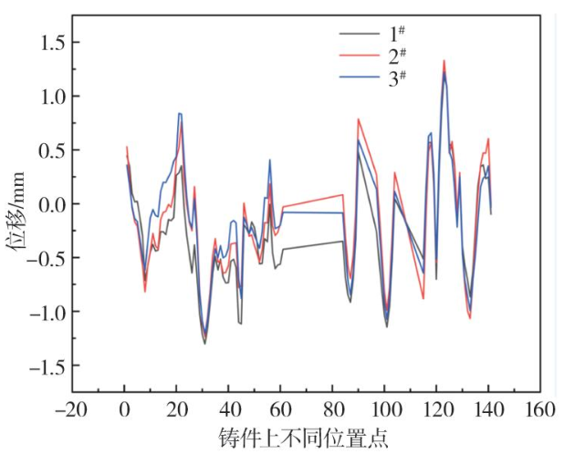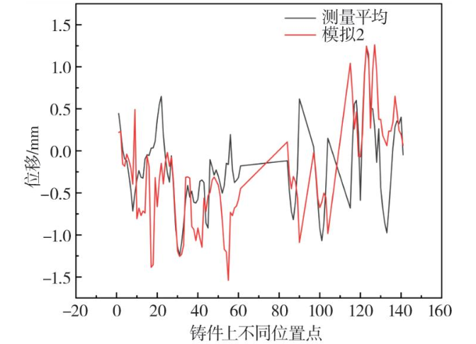 圖10 汽車車門殼體的三維掃描圖 為了更直觀地觀察鑄件的形變,采集了三組數據的多個關鍵部位,取點示意圖如圖11所示,并對三組數據進行平均后(如圖12所示)與模擬方案2進行對比,結果如圖13所示。結果顯示,三條曲線的整體趨勢基本一致,表明各位置的掃描結果具有相似的變化趨勢。在零位移點附近,三條曲線大致重合,說明整體變形偏差較小。然而,在某些區域,位移值的波動幅度存在差異,如2#線(紅色)在部分位置的峰值略高于1#和3#線。通過對測量值與模擬值的對比分析可以看出,兩條曲線在大多數位置點上表現出相似的變化趨勢和一致的變化方向,但在部分關鍵位置點(如接近位置點20和100附近)存在明顯差異,表明這些區域的模擬結果與實際測量結果存在一定偏差。