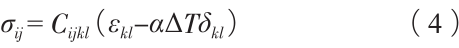 式中:σij 為應力張量(i,j=1,2,3,分別對應x、y、z三個方向,表征不同方向的應力狀態),Cijkl為材料彈性常數(i,j,k,l=1,2,3,描述材料的彈性響應特性),εkl為總應變張量(k,l=1,2,3,包含熱應變和彈性應變),α為材料的熱膨脹系數,ΔT為溫度變化,δkl為克羅內克符號(當k=l時,δkl=1;當k≠l時,δkl=0)。 在凝固階段的溫度場基礎上,結合熱彈性應力方程,計算溫度變化引起的應力場分布。應力的平衡方程為: