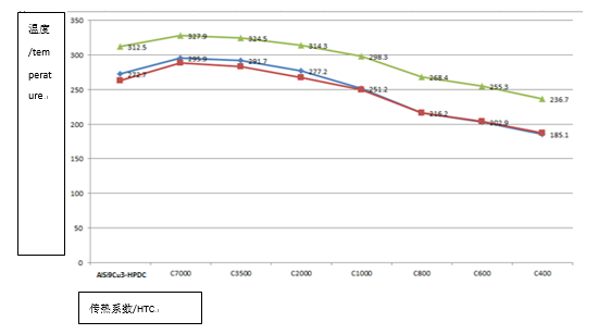 圖2/figure 2 通過圖2結果中的某點的數據對比證實:隨著界面傳熱系數的降低鑲塊本體溫度也在降低。 基于這個事實,為了提高鑲塊的使用壽命,保持良好的傳熱和冷卻條件,優化傳統CNC加工冷卻水路變得必要。因此,借助先進的3D打印技術,突破傳統CNC加工冷卻水路的限制,通過隨型冷卻和擴大冷卻水路散熱面積來確保鑲塊的快速冷卻。如圖3,是傳統CNC和3D打印鑲塊和冷卻水路設計對比: