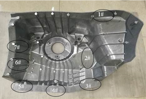 ![]() 圖1:鋁制減震塔結(jié)構(gòu)示意圖 原標(biāo)題:真空壓鑄鋁合金減震塔缺陷分析及改進(jìn) 汽車車身結(jié)構(gòu)件如副車架、減震器支座、后蓋框架、A/B柱等為承載受力件,與汽車安全性密切相關(guān)。這類結(jié)構(gòu)件通常具有復(fù)雜薄壁、尺寸較大等特征,由于在行駛中要保證汽車可靠的安全性,這些受力結(jié)構(gòu)件要求高的屈服強(qiáng)度及優(yōu)良的伸長(zhǎng)率。傳統(tǒng)的汽車結(jié)構(gòu)件大多由多個(gè)鋼制件拼接而成,通過(guò)沖壓、鍛造、焊接、鉚接等工藝生產(chǎn)。隨著節(jié)能減排的要求越來(lái)越高,燃油車和新能源汽車都大力推進(jìn)輕量化,因此車身結(jié)構(gòu)件的輕量化,即“以鋁代鋼”已成必然趨勢(shì),真空壓鑄工藝技術(shù)和高強(qiáng)韌壓鑄鋁合金的開(kāi)發(fā)十分關(guān)鍵。 減震塔屬于車身承載結(jié)構(gòu)件,對(duì)屈服強(qiáng)度和韌性要求高,且形狀復(fù)雜,是以鋁代鋼的典型結(jié)構(gòu)件。目前壓鑄鋁合金減震塔已廣泛應(yīng)用于某些中高端車型。然而,國(guó)內(nèi)壓鑄企業(yè)在該方面的研究開(kāi)發(fā)起步較晚,與大批量穩(wěn)定生產(chǎn)和應(yīng)用還存在一定的距離。 本課題為某主機(jī)廠開(kāi)發(fā)一款新能源汽車用鋁合金減震塔,對(duì)首輪試生產(chǎn)得到的減震塔壓鑄件的力學(xué)性能較差部位進(jìn)行缺陷分析,并對(duì)其壓鑄成形工藝提出了改進(jìn)措施。 鑄件首次試制及試驗(yàn)檢測(cè) 減震塔基本尺寸為532 mm×365 mm×299 mm,成品質(zhì)量(增加余量后)為4.043 kg,體積為1.53×106 mm3,投影面積為156 735 mm2,基本壁厚在3 mm左右,分左右件(對(duì)稱),其結(jié)構(gòu)示意圖見(jiàn)圖1,可以看出該產(chǎn)品屬于典型的復(fù)雜薄壁零部件。為保證要求的減震塔本體取樣壓鑄態(tài)伸長(zhǎng)率≥5%,采用真空壓鑄工藝制備,合金采用自主開(kāi)發(fā)的新型高強(qiáng)韌壓鑄鋁合金。 試制采用壓鑄機(jī)型號(hào)為IDR3500T,以保證具有足夠的合模力,結(jié)合減震塔的結(jié)構(gòu)特征,確定左、右減震塔按一模兩腔布局設(shè)計(jì),其整體澆注系統(tǒng)效果圖見(jiàn)圖2。主要壓鑄工藝參數(shù):壓室長(zhǎng)度為1 250 mm,充滿度為29.64 %,壓鑄時(shí)型腔的真空度為9×103Pa以下,達(dá)到高真空狀態(tài),壓鑄溫度為680-700 ℃,模溫控制在200 ℃以上。