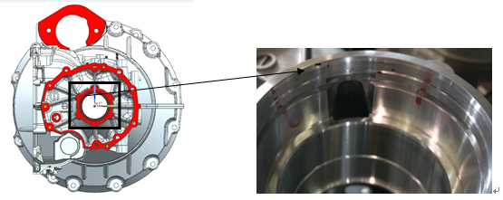 4、壓鑄工藝參數 壓鑄工藝參數選擇是:低速壓射速度為0.2±0.1 m/s;高速壓射速度為5.5±0.5 m/s;高速距離為550±10 mm;增壓距離為650±10 mm;澆注溫度為660±10℃ 5、機器人自動取件 因為產品凈重為15.18 kg,澆注系統質量為9.32 kg,采用機器人取件。取件手由3部分組成,分別是左側的三爪卡盤定位機構、右側的氣缸連桿夾緊機構和下方料柄抓緊機構組成。首先,左側的三爪卡盤伸進制品左側的圓孔內,并撐開漲緊,固定產品位置。 其次,右側連桿夾緊機構通過外面的兩個支撐柱頂住產品,2個仿形夾爪通過2組氣缸進行夾緊。2個仿形夾爪的夾緊位置選擇在工件的2個加強筋位置,防止了工件變形的可能。 最后,料柄抓緊機構通過下方平行氣缸夾緊料柄,平行氣缸上方裝有帶導軌的軟浮動機構,可以保證在夾緊料柄的同時自動對準料柄的中心。 二、壓鑄缺陷分析及改進: 產品油冷器回油孔直徑為14 mm,深度為6 mm,采用密封圈進行密封,要求孔內腔表面氣孔直徑小于0.4 mm,間隔大于8 mm,數量小于3個。實際試制發現,縮孔尺寸為2 mm×1.5 mm×2 mm,嚴重超標,比例達到90%,會導致產品泄漏。縮孔缺陷位置及大小見圖9。