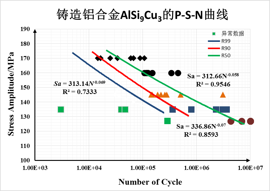 表3:鑄造鋁合金AlSi9Cu3不同可靠度下的壽命 在半對數坐標系中使用巴斯坎(Basquin)方程擬合各數據點,見式(3)。其中127 MPa應力水平數據僅擬合R50時使用。由于135 MPa應力水平下試樣壽命標準差較大,導致R99擬合曲線相關系數較低。