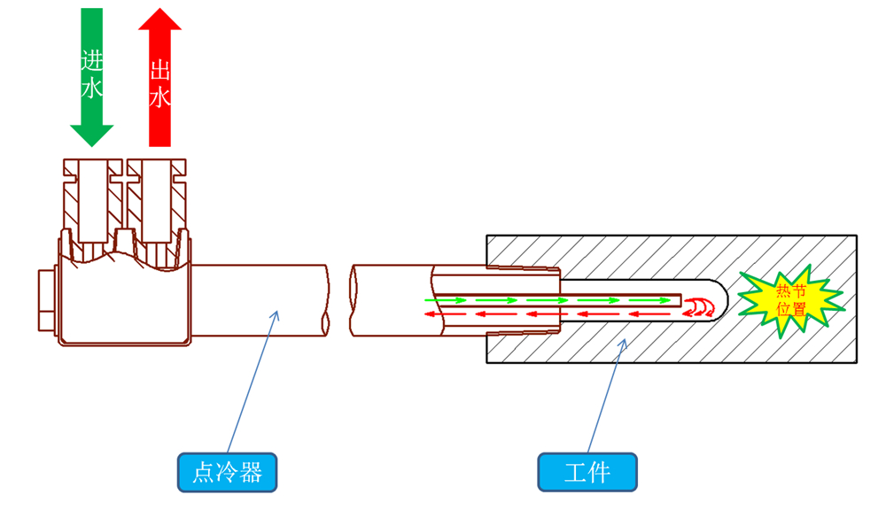 圖1:一般傳統(tǒng)的點冷冷卻方式 點冷器內部形成水循環(huán),冷卻水帶走孔底的熱量,可以減小工件上熱節(jié)尺寸。這種方式,可以有效的實現(xiàn)局部區(qū)域的溫度平衡,工藝成熟。但對于外徑尺寸受限制的部位無法有效應用。當需要保證模具壁厚的強度,底孔只能使用φ2~4 mm的超點冷,設計制造后實踐中受結構空間,水壓等影響,效果不理想,見圖2。