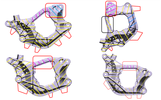 圖3:工藝參數(shù)計(jì)算表 3.澆排系統(tǒng)分析 3.1 澆注系統(tǒng)選擇 根據(jù)軟件計(jì)算出來的內(nèi)澆口截面積,再結(jié)合產(chǎn)品結(jié)構(gòu),將所有的進(jìn)澆可能性方案全部導(dǎo)入軟件。圖4為不同位置進(jìn)澆分析,其中黃色線為各自的填充區(qū)域,由黑線間隔,粉色線和藍(lán)色線為融合金屬液填充區(qū)域。其中對(duì)4個(gè)方案進(jìn)行分析和判斷如下:方案1共五個(gè)澆口,澆口分布均勻,進(jìn)澆平衡,可實(shí)現(xiàn)整體進(jìn)澆。壓力也相對(duì)傳遞均勻,保證致密度。需注意最末端填充區(qū)域,有冷料堆積充填與排氣不良風(fēng)險(xiǎn)。方案2共三個(gè)澆口,產(chǎn)品大體積區(qū)域?qū)?yīng)大澆口,保證充填質(zhì)量與壓力傳遞。但厚大澆口容易造成局部溫度過高,引起變形及對(duì)模具形成不良影響。同時(shí)此擺放位會(huì)拉長充填行程。方案3共三個(gè)澆口,產(chǎn)品大體積區(qū)域?qū)?yīng)大澆口,保證充填質(zhì)量與壓力傳遞。但厚大澆口容易造成局部溫度過高,引起變形及對(duì)模具形成不良影響 。方案4共三個(gè)澆口,產(chǎn)品大體積區(qū)域?qū)?yīng)大澆口,保證充填質(zhì)量與壓力傳遞。但厚大澆口容易造成局部溫度過高,引起變形及對(duì)模具形成不良影響。