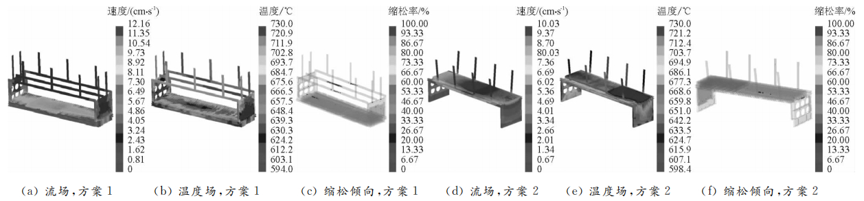 圖3:鑄造工藝設計方案2 此澆注系統采用和方案1類似的形式,其中側冒口直徑Φ40mm,內澆口厚度12mm,長度為190mm,橫澆道、直澆道、內澆道截面積比為1:2.8:4.6。方案2與方案1澆注系統相比,有著相同的澆口比,但是鋁 液進入底板上升高度更高。 3、CAE模擬分析 CAE模擬從充型結束溫度、各部位充型時間來對比方案的溫度場分布是否均勻,鑄件底板部位是否充型迅速,并根據縮松情況判斷鑄件可能出現缺陷的部位,見圖4。可以看出,①充型結束方案1溫度場更均勻;②根據鑄件各部位充滿時間判斷鑄件重要部位底板,方案1充型更平穩;③去除后,鑄件縮松缺陷相當。