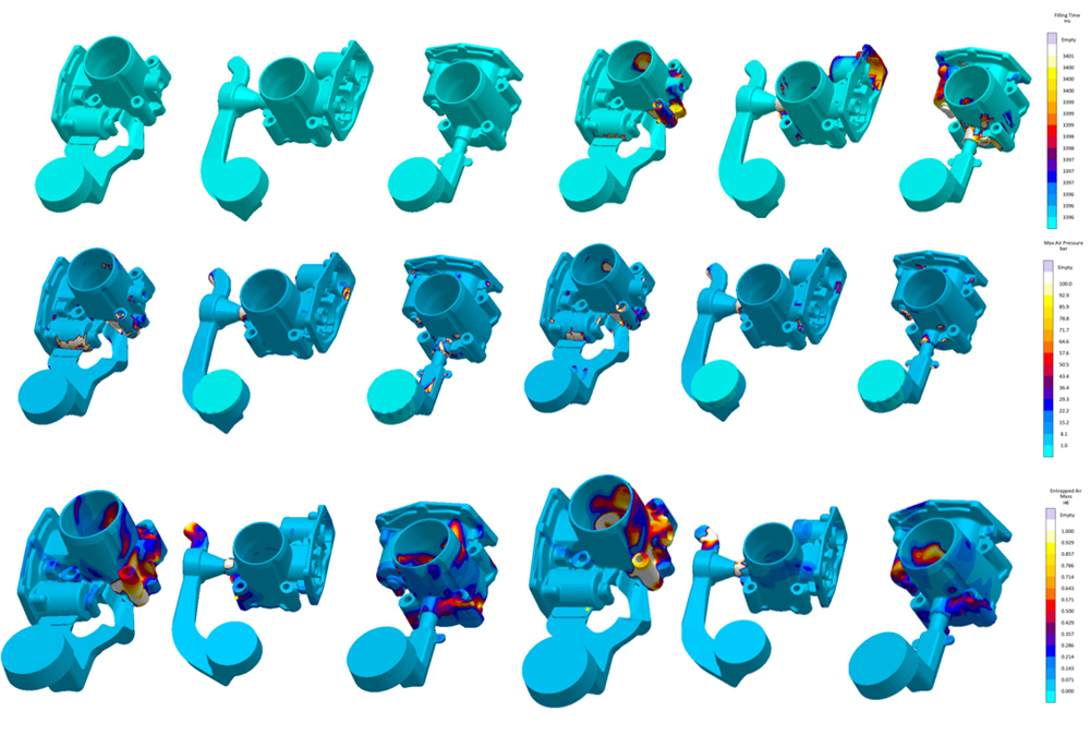 圖2:壓射方案 2.1.1 澆注方案一設計 如圖所示,澆注方案一澆口數量設計為雙股,分別設計在電機安裝位與閥板安裝位的側壁區域,選用直徑為60mm的壓射沖頭,壓射速度比為1:14;此澆注方案的優點在于金屬液的流程相對較短,對充填過程中的溫度降低值影響較小;設計三股流道,有利于壓力的傳遞與金屬液的補縮,對減少后期生產過程中出現縮孔缺陷風險有一定的正面作用;其缺點是由于產品分型與結構原因,澆道必須設計有一定的臺階位與薄壁區域,這些位置在后期的充填過程中容易出現包卷氣體的現象,并將氣體帶入型腔,后期殘留在產品中的可能性較大;另外,此產品電機安裝位不加工,澆口設計在此處,容易直接沖刷內壁型芯,且澆口位置溫度較高,容易導致電機安裝位置出現拉模、沖蝕的缺陷;且澆口位置不加工,對于后期壓鑄件的切邊與清理都有一定的負面影響; 2.1.2 澆注方案二設計 如圖所示,澆注方案二澆口數量設計為一股,位置設計在閥板安裝位的側面圓孔區域,選用直徑為60mm的壓射沖頭,壓射速度比為1:30;此澆注方案的優點是澆道可以設計的比較圓滑過渡,有利于金屬液的充填與減少充填過程中包卷氣體的現象,減少澆道帶入的氣體導致的缺陷;澆口設計在加工面位置,可以減少壓鑄件切邊和清理的工作量,降低生產成本;單股澆口,可以防止多股金屬液進入型腔后相互沖擊造成渦流、卷氣、氧化的現象;其缺點是對于澆口遠端的熱節位置的補縮作用基本缺失,需考慮其他的輔助補縮方案;且金屬液的流程相對較長,對充填過程中的金屬液溫度有一定的負面影響,局部位置可能出現冷料缺陷; 2.1.3 澆注方案三設計 如圖所示,澆注方案三澆口數量設計為一股,位置設置在閥板安裝位的側面圓孔區域,選用直徑為60mm的壓射沖頭,壓射速度比為1:30;此澆道的優點是澆口設計在加工面位置,可以減少壓鑄機切邊與清理的工作量,降低生產成本,澆道設計為直線充填的樣式,可以使鋁液充填行程減少,鋁液的溫度損失量減少;沖頭與澆口距離短,可以保證沖頭壓力的有效傳遞;其缺點是后期生產調節參數的靈活性較差,無法通過調整壓鑄參數改善產品質量。 2.2 產品工藝參數方案設計 根據對ETC節氣門鋁殼體鑄件的結構分析與質量要求,此產品選用350T壓鑄機,一模一腔設計,鑄造壓力設置為100MPa,保證有足夠的補縮效率,減少后期縮孔缺陷的出現;澆注溫度設計為660-680℃,動定模芯預熱至180-200℃;充填時低速設置為0.25m/s,高速速度設置為3m/s,高速切換點分別測試340mm與350mm兩個位置,以此確定出金屬液最平穩的充填狀態和最少渦流與卷氣的現象;同時采用線冷加點冷的溫控系統,保證模具的熱平衡狀態良好; 3、一鍵式導入的數值模擬與對比分析 鑄件的充填與凝固過程控制對壓鑄件的質量有著決定性影響,但由于這兩個過程在生產過程中都是在密閉不可見的型腔中完成,無法直接或間接觀測與分析,因此前期的數值模擬就尤為重要;通過使用邁格碼DOE功能,一鍵式導入上述三種壓射方案與兩個測試高速切換位置,一次性計算出多種方案,最快速預測出缺陷位置,找出最佳方案,提升產品內部質量,減少開發周期,降低生產成本。 3.1 充填過程模擬與分析 如圖3所示,圖片第一排模擬結果為充型時間,前三個方案的高速切換位置為340mm,充型時間短,后三個方案的高速切換位置為350mm,充型時間長,同時亮色位置為三種壓射方案最后充型的位置; 圖片第二排結果為最大氣壓結果,模擬結果亮色處為高氣壓位置,氣孔風險大。通過對比發現,方案二與方案五氣壓值相對較低,氣孔風險相對較??; 圖片第三排結果為充型卷氣結果,模擬結果亮色位置含氣量高,泄露風險性大。通過對比發現,方案二與方案五卷氣值相對較低,泄露風險相對較??; 綜合充型過程模擬結果分析,方案二與方案五的氣壓與卷氣相對較低,而方案二高速切換位置靠前,充型時間短,所以整體成型性良好。