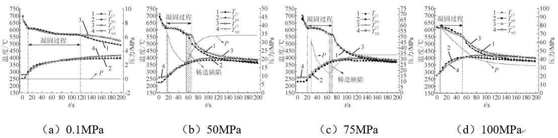 表3:擠壓鑄造鋁硅系鋁合金力學性能 王春濤等研究了Al-7Si-Mg合金在擠壓鑄造過程中壓力對收縮缺陷形成的影響。圖5為在不同擠壓鑄造壓力下合金凝固過程中溫度與壓力的變化曲線,P為合金凝固過程中的底部壓力。凝固結(jié)束前,50 MPa鑄造比壓難以使鑄件的凝殼繼續(xù)變形,對內(nèi)部糊狀區(qū)的補縮作用減弱,因而在底部壓力達到極小值后的凝固階段容易產(chǎn)生收縮缺陷。鑄造比壓增大到75 MPa,凝殼達到臨界尺寸的時間推遲,鑄件易產(chǎn)生缺陷的時間區(qū)間變窄,而在100 MPa的鑄造比壓下,凝殼可以持續(xù)發(fā)生變形,實現(xiàn)對內(nèi)部糊狀區(qū)的補縮,消除收縮缺陷。MALEKI A等發(fā)現(xiàn),擠壓鑄造壓力(外壓小于100 MPa)會減小LM13(Al-12.3Si-1.3Cu-1.2Mg-0.4Fe)合金中α-Al的晶粒尺寸和二次枝晶間距(SDAS),并降低共晶硅顆粒的平均長徑比。ABOU E L的研究表明,增大擠壓鑄造壓力可以獲得組織致密的Al-6Si-0.3Mg合金。在鑄造比壓為160 MPa的條件下,合金屈服強度、抗拉強度和伸長率分別達到114、132 MPa和6.5%。而且,與普通鑄造合金相比,合金達到峰值時效所需的時間減少,其屈服強度、抗拉強度和伸長率均明顯提高,分別達到190 MPa、208 MPa和8%。