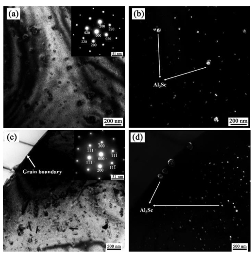圖12:合金Al-5Zn-2Mg-1Cu-0.2Sc時效120℃×24h的金相與SEM組織 從圖13a和圖13b中的明場像和暗場像都可以發現,在晶粒內部除GP區和少量η′(MgZn2)相外,均勻分布許多細小的顆粒。通過在[001]軸獲取的該區域的超點陣衍射斑點,經過軟件計算出其晶格常數a=0.4172 nm,面心立方結構(FCC),Al3Sc的晶格常數為0.410 nm,鋁基體的晶格常數為0.405 nm,可確定這些顆粒為Al3Sc相。對圖10a中的顆粒進行尺寸統計,Al3Sc相的平均晶粒尺寸約為22 nm。從圖13c和圖13d的明場像和暗場像中可以發現,在晶界處有一些尺寸較大的第二相,通過分析在[011]軸獲取的該區域的超點陣衍射斑點,確定這些第二相為Al3Sc。根據第二相粒子強化機制,這些細小彌散的Al3Sc粒子均勻分布在基體中,通過對位錯運動的阻礙作用可以起到顯著的強化效果,這是含Sc合金強度提高的主要原因之一。