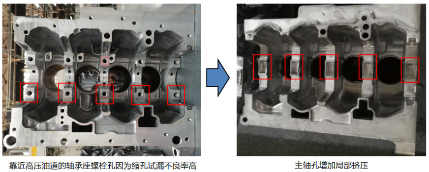 圖5:增加高壓點冷,縮孔得到明顯改善 某缸體加工后進行100%的產(chǎn)品泄漏測試,發(fā)現(xiàn)產(chǎn)品試漏不良率較高,經(jīng)過對不良品統(tǒng)計分析,發(fā)現(xiàn)95%為高壓油道測試不合格。CT掃描發(fā)現(xiàn),靠近高壓油道的主軸承座螺紋孔底部存在較多縮松,增加預(yù)鑄孔后試漏不良率并未得到明顯改善。隨后在主軸孔增加局部擠壓工藝(見圖6),使該位置更加致密,從而減少縮孔、縮松,經(jīng)過驗證,試漏不良率從4%下降至0.2%,效果明顯。