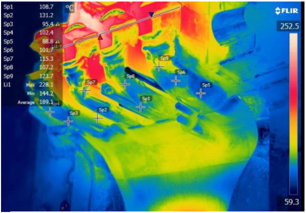 圖6 使用局部擠壓,該位置試漏不良率得到明顯改善 好的工藝方案同樣對降低縮孔比例以及降低鑄件表面粘模、拉傷有著很大的作用。有時通過單純的增加預(yù)鑄孔不一定能解決內(nèi)部縮孔的問題,這時候需要運用點冷,即在模具或者型芯內(nèi)部增加冷卻循環(huán)通道。點冷分為普通點冷和高壓點冷,兩者的選用仍需通過模具溫度來確定,如果模具溫度較高,選擇高壓點冷可迅速將熱量帶走,這種工藝方案非常實用,也在很多壓鑄廠成功應(yīng)用。同時需要定期檢查和更換型芯,避免型芯變形、漏水等帶來其他質(zhì)量問題。 目前在壓鑄件的重點位置采用局部擠壓工藝的運用越來越廣泛,局部擠壓使內(nèi)部鑄造質(zhì)量更加致密,因此產(chǎn)生縮孔、縮松的比例更低。在局部擠壓過程中重點需要控制擠壓的起始時間、擠壓銷的噴涂(避免擠壓銷卡滯),同時對擠壓深度也應(yīng)進行監(jiān)控。 除了上述方案外,模具表面處理、冷卻水類型、噴涂方式、噴涂時間、噴涂角度、噴涂距離和噴涂路徑等都需要進行重點考慮。如冷卻水,對于一些要求較高的鑄件,很多壓鑄廠采用純凈水進行冷卻,避免冷卻通道結(jié)垢,從而減小冷卻流量,導(dǎo)致模具溫度達不到要求。針對噴涂的工藝設(shè)置,現(xiàn)在仿形噴涂得到越來越多的運用,同時對噴嘴位置的定期校準也很必要。總的來說,工藝參數(shù)的制定對壓鑄件質(zhì)量影響很大,需要通過大量的試驗和經(jīng)驗進行驗證,同時也是一個持續(xù)優(yōu)化的過程。 2.4 過程控制 過程控制的主要目的是確保相關(guān)參數(shù)在已制定工藝方案的規(guī)定下得到穩(wěn)定的實施。模具溫度的監(jiān)控尤為重要,目前使用熱電偶可對模具溫度實時監(jiān)控,但由于不能覆蓋所有的位置,因此使用熱成像儀或者測溫槍對模具溫度進行定期的測量十分必要。熱成像儀除了用于具體問題分析外,在模具溫度參數(shù)制定時進行連續(xù)的溫度測量非常重要(見圖7)。