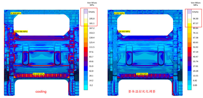 圖7 增加溫控后模具溫度對比 增加空度控制后,整體熱量數值雖幾乎達到平衡,但由于模具溫度場分布不均勻,產品的變形狀態和米塞斯應力分布狀態并沒有得到改善,反而呈現變大的趨勢,產品最大變形位置從7.904mm增大至8.969mm,米塞斯應力最大值從174.8Mpa增加至195Mpa.(圖8,9所示)