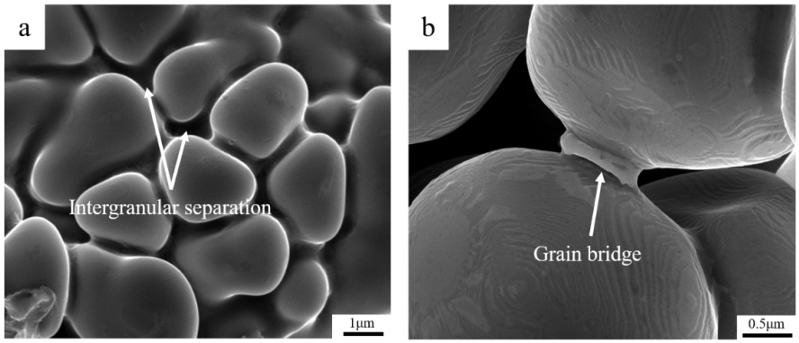 圖13 不同增壓比壓下Al-Zn-Mg-Cu合金流變壓鑄件試樣孔洞數量及形狀因子與等效直徑的變化曲線:(a)數量變化;(b)形狀因子變化 裂紋源的產生,孔洞缺陷是其主要影響因素,在半固態流變壓鑄中,孔洞往往是由凝固補縮不足引起的。合金凝固初期階段,初生晶粒不斷生長并形成固相骨架相搭接在一起。然而凝固后期在收縮的作用下,晶粒之間在收縮應變的作用下產生晶間分離(見圖 14a),在分離的初始階段會由于液態金屬的不斷補縮不會導致裂紋的萌生,但是隨著凝固進行,合金固相率逐漸增加以及液態金屬的不斷減少使得晶間分離得不到補縮,從而形成裂紋源。這種現象在增壓比壓不足時尤為突出,增壓比壓不能夠推動液態金屬對晶間進行有效的補償,導致了疏松縮孔的存在。由于補縮不足導致的晶間分離通常產生于多個晶粒的交匯處,晶間殘留的液態合金有一部分會以晶間搭橋(圖 14b)的形式存在。若在凝固過程中受到一定的應力作用,晶間搭橋則會產生形變,當應力超過了晶間搭橋的結合強度,搭橋結構被破壞,相鄰晶界交匯處的晶間分離會連接在一起,形成大的孔洞,導致裂紋的形成并沿著晶界擴展,如圖 7a中斷裂尾梢所示。