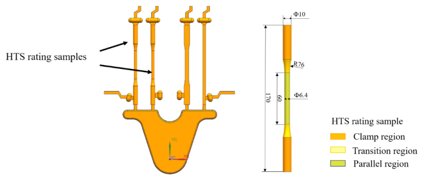 表1 試驗用Al-Zn-Mg-Cu合金化學成分 wb/% 試驗采用電阻爐將Al-Zn-Mg-Cu合金原料熔化至720 ℃,保溫30 min消除爐料的遺傳性,并對熔體持續通入氬氣進行精煉約10 min,除氣扒渣后靜置熔體,隨后將電阻爐中漿料轉移至EMS-05SM型可控溫式電磁攪拌爐,再次通入氬氣約5 min進行除氣,待熔體冷卻至640℃時,立即開始電磁攪拌,攪拌功率固定為3kW,攪拌頻率恒定為20Hz。在電磁攪拌期間及時用K型熱電偶監測金屬漿料溫度,待漿料降溫至630 ℃時制得所需半固態漿料用于流變壓鑄。 在不同的增壓比壓下分別壓鑄成形鑄件,并獲得20根熱裂評估試樣進行熱裂傾向評定,見圖1。試樣由3部分組成:夾持段,過渡段和平行段。采用半定量熱裂傾向評定方法研究Al-Zn-Mg-Cu合金壓鑄件的熱裂傾向,該方法主要考慮兩個因素:熱裂產生裂紋程度及熱裂條數,同時將各因素分成不同的級別綜合評定熱裂傾向,其計算方法為: