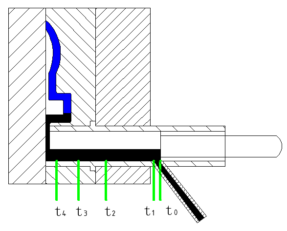 圖3 壓鑄機壓射過程示意圖 圖3為壓鑄機壓射過程示意圖。影響薄壁殼體質量的關鍵參數有速度、壓力及時間。慢速壓射速度,由t0-t1和t1-t2兩段組成,用V01及V12表示;高速轉換點t2開始位置(壓鑄最重要的參數),高速壓射區間為L2(t2-t3);V充為填充速度;P比為增壓比壓。t充、t增和t留為填充時間、增壓時間和留模時間。 實際使用的壓鑄主要工藝參數見表2。