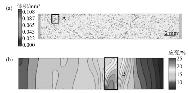 圖11顯示了9號樣品中孔洞的CT形貌以及其對局部應變的影響。樣品邊部有大孔洞,即A和C兩處,B處有孔洞團簇,如圖11a所示。拉伸過程中,A、B和C處都產生了較大的變形,即產生應變集中,如圖11b所示。隨著拉伸的繼續,樣品最終斷裂發生在局部孔隙率最高處。表明樣品大孔洞所在的位置對樣品的變形也有影響,當孔洞的位置在樣品的邊緣時,則該區域更容易引起應變集中。與Weiler和Wood等人的工作一致,靠近樣品邊緣的孔洞更容易產生大的應變。由于孔洞形狀的不規則性,非常容易在孔洞的尖角處產生應力集中,從而產生裂紋。當孔洞靠近樣品邊緣,則更加容易產生與邊界相連通的裂紋,則相當于在樣品的邊界上形成了缺口,容易造成顯著的應力集中,迅速發生斷裂。因此,當樣品的邊緣處存在大孔洞或團簇時,邊緣處的孔洞也會對樣品的斷裂有著一定的影響。