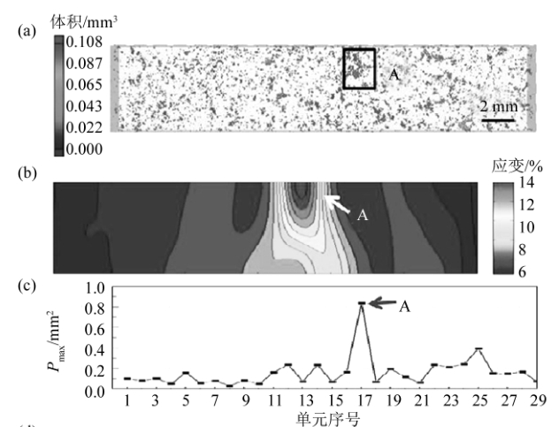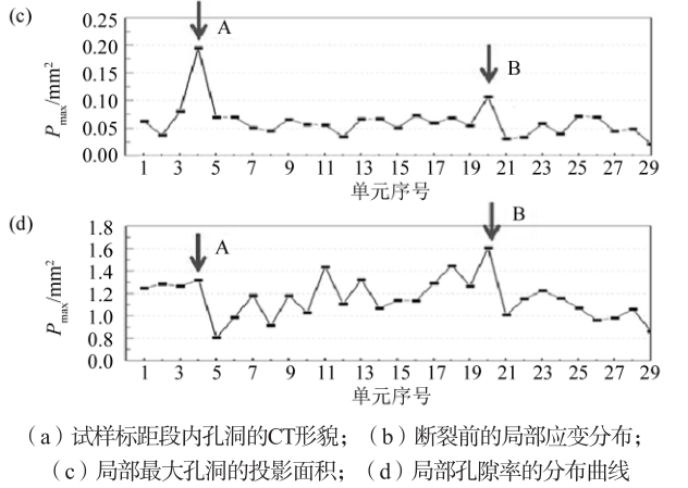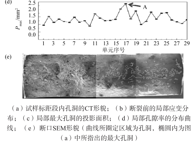 圖8 孔洞特征參數分析(19個試樣):標距段最高值與斷口值的對比 3、分析與討論 3.1 最大孔洞尺寸對斷裂行為的影響 Wood等研究了含大孔洞的壓鑄鎂合金樣品拉伸過程中的孔洞演變,發現只有大孔洞發生了明顯的變形,因此認為只有大孔洞才是影響材料斷裂的關鍵,而總體孔隙率對斷裂位置沒有顯著影響。從圖8b可以看出,當樣品中最大孔洞的投影面積>0.4 mm 2,最大孔洞是決定材料斷裂位置的關鍵,然而當材料內部沒有大孔洞時,即最大孔洞的投影面積<0.4 mm 2 時,最大孔洞與材料的斷裂位置無關。但是,對于只有小尺寸孔洞的樣品,即在沒有較大孔洞的情況下,樣品發生的斷裂有區域內部的整體孔隙率決定。圖9a展示了7號樣品孔洞的CT形貌,A為樣品中的最大尺寸孔洞,其投影面積為0.2 mm 2。拉伸變形過程中,未在A處發現應變集中,應變集中發生在局部孔隙率最高的B處,如圖9b-d所示,這與Wood的研究相符合。在15號樣品中,拉伸時,在A處單元內產生應變集中,如圖10所示。可以認為,含有最大尺寸孔洞A的單元是引起材料斷裂的關鍵。然而,在單元內部,往往大孔洞比其他小孔洞大得多,因此擁有大孔洞的區域內,其整體投影面積的孔隙率也擁有較高水平,如圖10d所示,A處的局部孔隙率也為最大值,所以可認為,是最高的局部孔隙率引發了材料的斷裂。因此,最大的孔洞會對材料的斷裂產生一定影響 ,但是卻不是最主要因素,只有當材料內部擁有大孔洞,即孔洞投影面積超過0.4 mm 2時,才會對樣品的斷裂產生顯著影響,當材料內部沒有大孔洞(投影面積超過0.4 mm 2)時,最大的孔洞對材料斷裂位置的影響較小。