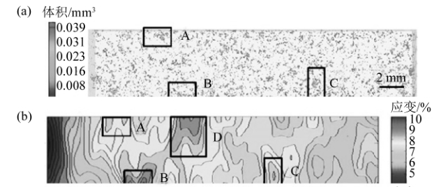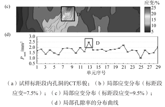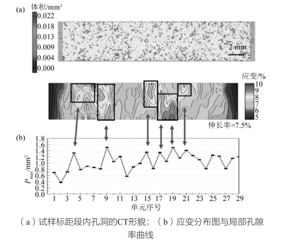 圖9 7號試樣(最大孔洞的投影面積<0.4 mm 2 )中局部孔隙率和大尺寸缺陷對應變的影響