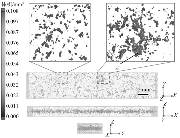 圖2 DIC試樣的形貌 2、試驗結果 2.1 CT 結果的標定 CT掃描原理是基于不同密度材料對X射線吸收能力的不同,孔洞內部主要是空氣,其密度遠遠低于鋁合金基體,因此CT掃描能準確識別出材料內的孔洞。CT圖像中的不同顏色代表孔洞的體積大小。如圖3所示,在試樣標距內有大量彌散分布的孔洞,主要為數量較多、尺寸較小的氣孔和數量較少但體積較大的縮孔。
