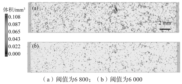 圖3 15號試樣中孔洞的CT形貌(A區域) 由于工業CT是使用X射線對樣品進行掃描后,再通過VGstudio軟件進行三維重構,因此軟件的后處理對CT結果的準確性有著重要影響。后處理軟件中的參數閾值對后處理的結果有著直接影響,選取不同的閾值,會得到不同的結果,如圖4所示(所掃描區域中灰度值大于閾值的部分被認為是材料,而低于閾值的部分被認為是孔洞,即圖4中的A區域)。同一個樣品,當選取閾值為6800和6000時,樣品所得的CT后處理結果差異明顯,圖4a中,樣品含有大孔洞與小孔洞混合,而圖4b中,樣品沒有大孔洞且分布均勻??梢姡撝祵T后處理結果有顯著影響。