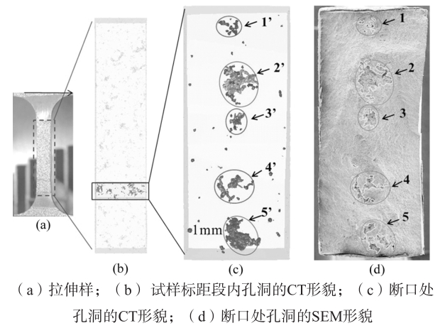 圖4 不同閾值對標距段內孔洞CT形貌的影響(15號樣品) CT結果的標定是保證其準確性的關鍵,為確保CT數據重構的孔洞數據準確,首先,根據拉伸試樣斷口的SEM形貌確認孔洞形貌和分布,在將SEM圖片中的孔洞特征與CT結果中的斷口處孔洞特征進行對比,然后,調整CT數據的后處理參數,使斷口處孔洞的CT形貌和分布與SEM的形貌和分布一致,以獲得較為可靠的CT結果,即孔洞的形貌和分布圖。由于SEM斷口為樣品斷裂時的一個崎嶇不平的面,而CT選取部位為一個三維結構,因此CT圖像上會觀察到更多的孔洞。具體如圖5所示,由圖5d中的SEM形貌可看出,試樣斷口上的孔洞主要分為5個區域(標出部分為孔洞),根據各個區域的孔洞特征調節CT后處理參數,直至CT結果中各個區域的孔洞特征與SEM結果一致,如圖5c。斷口處缺陷的CT形貌和分布與SEM圖像中的一致,則可認為CT結果準確有效。因此,采用這種方式對19個試樣的CT結果進行了標定,以保證CT結果的可靠性。