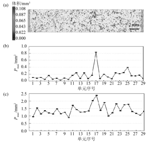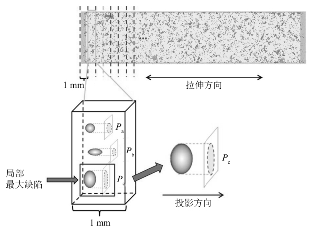 圖5 CT結果標定示意圖 (8號樣品) 2.2 孔洞特征參數的獲取 基于CT掃描結果可獲取每個試樣內部每個孔洞的體積、等效直徑、沿不同方向(沿x、y、z方向)的投影面積及位置(中心坐標)等信息。每個試樣中的孔洞尺寸和分布各不相同,為了定量地研究孔洞的分布特征,將試樣標距區域沿軸向劃分成厚度為1 mm的多個單元(試樣標距段有29 mm,因此可以劃分為29個單元),可計算每個單元內的局部孔隙率,如圖6所示。將試樣內部的孔洞沿拉伸方向進行投影,獲取每個孔洞的投影面積,可以得到最大孔洞的投影面積來表征最大孔洞的尺寸,并計算每個單元內所有孔洞沿拉伸方向的投影面積之和,用單元內局部孔洞的投影面積之和來表示局部孔隙率。如圖6所示,單元2中有3個孔洞,即Va 、Vb 和Vc ,它們沿拉伸方向的投影面積分別為Pa 、Pb 和Pc ,則單元內最大孔洞投影面積為Pc ,局部孔隙率為Psum =Pa +Pb +Pc 。在圖7b和c中分別給出了15號試樣標距區域內孔洞最大投影面積Pmax 和局部孔隙率Psum沿軸向的分布曲線。