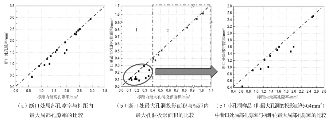 圖7 15號試樣中孔洞的形貌和分布 2.3 孔洞特征參數與斷裂位置 為了探明試樣局部孔隙率和試樣內部最大孔洞對試樣斷裂位置的影響,將試樣最大的局部孔隙率和最大孔洞的投影面積與斷口處的數據進行了對比分析。將每個試樣斷口處的局部孔隙率與試樣標距內的局部最高孔隙率進行比較,可得到試樣斷口處局部孔隙率與標距內最高局部孔隙率的關系,19個試樣的分析結果如圖8a所示。將斷口處的最大孔洞投影面積與整體最大孔洞的投影面積進行比較,可得到試樣斷口處最大孔洞與試樣內部最大孔洞的關系,19個試樣的比較結果如圖8b所示。 圖8a中可看出,19個樣品中有13個樣品的數據點落在X=Y的直線上(即對角線上),表明這13個樣品的斷口所在單元的局部孔隙率與標距內的最大局部孔隙率相同,而其余6個數據點未落在X=Y直線上的點則落在直線X=Y附近,表示這部分樣品的斷裂處的局部孔隙率稍低于標距內最高孔隙率,但差異較小??梢杂^察到,19個樣品的標距內最高局部孔隙率與斷口處局部孔隙率之間呈現明顯的相關性。而圖8b中可以看出,當最大孔洞的投影面積>0.4 mm 2 (區域2)時,點落在直線X=Y上,標距內最大孔洞的投影面積與斷口處局部最大孔洞的投影面積呈明顯相關性,但是當樣品內部沒有大孔洞存在時,即最大孔洞的投影面積<0.4 mm 2時(區域1,共12個試樣),未觀察到明顯的相關性。而這12個沒有大孔洞的樣品(區域1)中,標距內最高局部孔隙率與斷口處局部孔隙率之間仍舊呈現明顯的相關性,如圖8c所示。表明局部孔隙率是決定斷裂位置的關鍵因素。