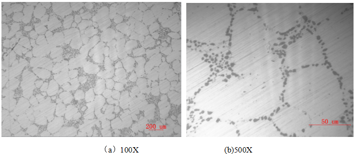 表4 鑄件取樣拉伸試驗結果 從主軸承蓋上取樣,熱處理后金相組織見圖9,可以看出,α-Al相呈球狀,變質正常,分布均勻,通過截線法計算晶粒大小為109.8 μm。共晶Si顆粒較為圓整,并均勻分布在初生α-Al晶界處,無針狀或大塊硅顆粒;平均Si顆粒尺寸小于8.0 μm,最大Si顆粒尺寸小于10.0μm。