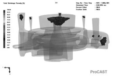 圖7 3 s時刻鑄件的充型凝固溫度場 從圖中可以看出,金屬液沿著內澆道貼型腔壁注入然后逐漸充滿型腔,在整個充型過程中,金屬液流動相對較平穩(wěn),沒有出現(xiàn)明顯的卷氣現(xiàn)象。該壓殼鑄件的縮松、縮孔模擬結果如圖8所示。