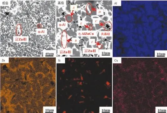 圖4 高壓鑄造1號(hào)合金SEM形貌及EDS 圖5為2號(hào)合金的SEM形貌及元素分布面掃描圖,其中Al元素呈深藍(lán)色,Zn元素呈黃棕色,占據(jù)了整個(gè)照片的視野。結(jié)合圖5中A處與表4中能譜分析,確定為α-Al相,α-Al相枝晶中心固溶的Zn元素為11.34at%,相比于1號(hào)合金,明顯升高。含Si元素的部分呈亮黃色,主要分布于晶界處,紅棕色區(qū)域代表Cu元素的分布區(qū)域。D、F處為共析α+η(η為富Zn相),B處能譜分析只含有硅元素,確定為初晶硅,尺寸達(dá)到30 μm,說(shuō)明鋅含量的升高促進(jìn)了初晶硅的析出,增加了合金的硬度,降低塑性。E處針狀的相為β-Fe相,是導(dǎo)致合金力學(xué)性能惡化的主要原因,特別是塑性和韌性。元素Zn和Cu在晶界共晶組織處存在著明顯的富集現(xiàn)象,但各元素的富集偏析程度也存在差別:Si元素偏析最嚴(yán)重,Cu元素偏析次之,Zn元素偏析較輕。