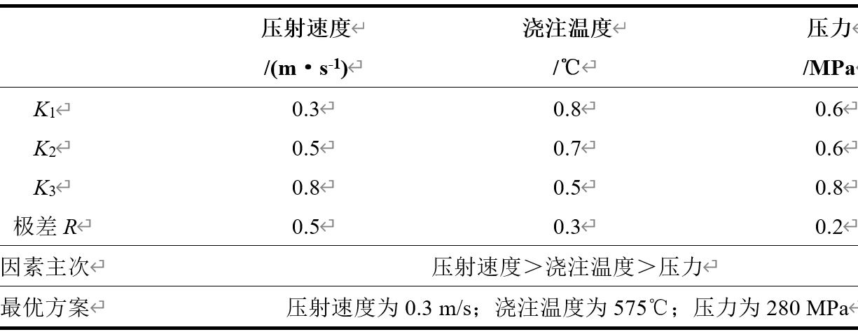 (3)隨著壓射速度由0.2 m/s升高至0.3 m/s,組織由粗大的薔薇晶逐漸演變為細小的球狀晶,力學性能提升,壓射速度為0.3 m/s時達到最大值;隨著澆注溫度由615℃降低至575℃,組織由片狀及針狀演變為細小均勻的顆粒狀,澆注溫度為575℃時達到最大值;隨著壓力由240 MPa提升至280 MPa,晶粒趨于細小圓整,力學性能提升,壓力為280 MPa時達到最大值。