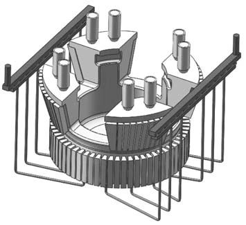圖1 活塞鑄件三維圖 1.2 初始鑄造工藝 球墨鑄鐵活塞鑄件采用呋喃樹脂砂造型、半封閉式澆注系統,澆注系統各橫截面面積的比例為:直澆道∶橫澆道∶內澆道=1∶1.65∶0.96。兩包澆注,兩個Φ100 mm直澆道,兩條130 mm×100 mm橫澆道,12根Φ40 mm內澆道,8個Φ180 mm發熱冒口,4個底腳四周放置專用冷鐵,其余位置放置方冷鐵,其工藝三維圖如圖2所示。鐵液澆注溫度在1 320~1 340 ℃,出液前靜置5~8 min,鑄件毛坯重量26 000 kg,澆注重量為31 000 kg,澆注后10天開箱。