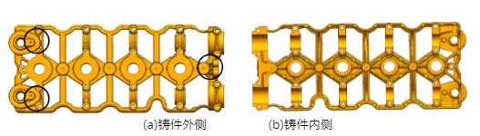 通過對充型凝固過程及縮孔、縮松的分析比較,認為方案3的效果最好。但根據圖3c充型50%時的充型仿真結果,金屬液匯流處于型腔通道上,充填和排氣條件較好;同時縮孔、縮松仿真結果顯示,3種方案中鑄件B處孔隙未發生明顯改變。故考慮可去除圖4f中B附近溢流槽,從而能降低該區域溫度,加快凝固,提升壓鑄效率。改進方案的縮孔、縮松仿真結果和試模鑄件見圖7。圖7a與方案3(見圖5c)中的結果相比,鑄件厚大區域的3處縮孔有1處被直接消除,另外兩處縮孔體積減小,鑄件縮孔體積為1.43×10-3cm3。模擬結果顯示,優化方案滿足鑄件品質要求,故采用優化方案進行開模、試模,試模鑄件經加工后見圖7b。