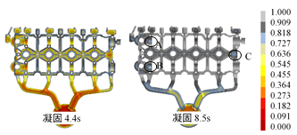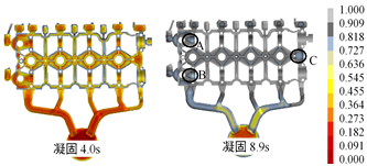 (b)凝固過程 圖6 改進方案的充型過程和凝固過程