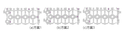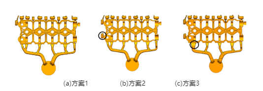 圖4 3種澆注系統方案的凝固過程 圖5 不同澆注方案下鑄件縮孔預測